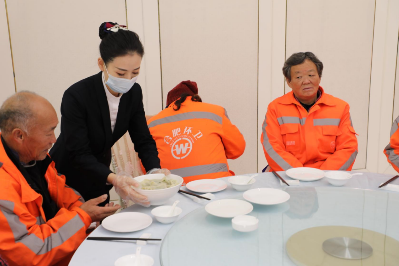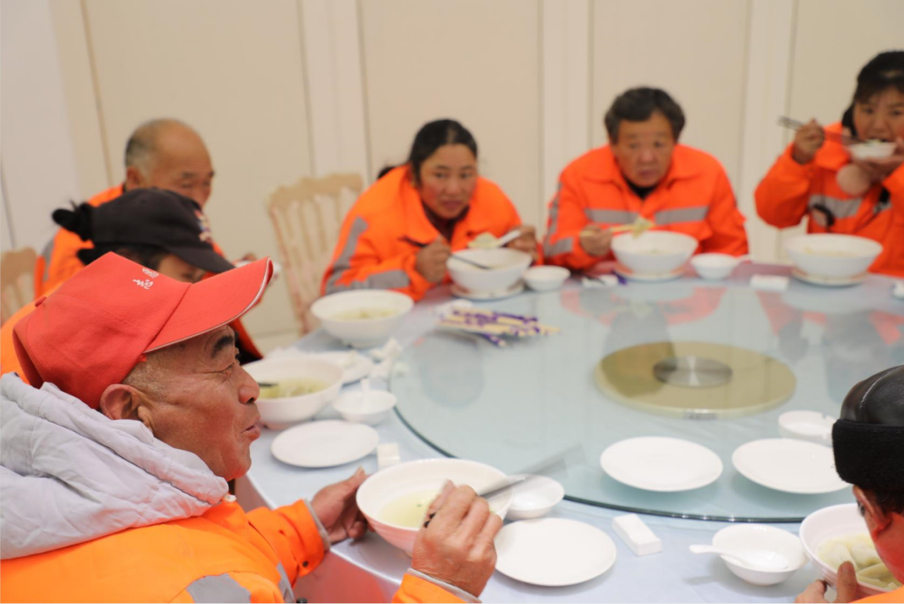 隨后,環(huán)衛(wèi)工人們作為主角一一登場,隨著一盤盤熱氣騰騰的餃子出鍋、上桌,每個人都忘卻了冬日的寒意,環(huán)衛(wèi)工人們和志愿者親切地拉起了家常,暢談著如今的美好生活。窗外寒氣逼人,活動室里卻是暖意融融。