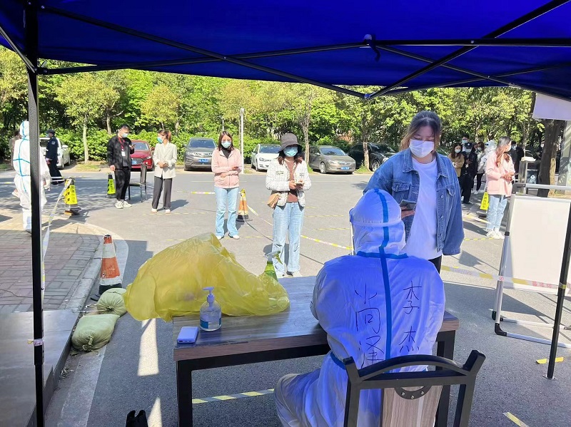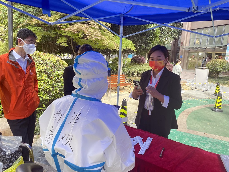 按照住宅小區(qū)、中小企業(yè)及樓宇辦公場所等區(qū)域劃分,從百樂門到尚澤大都會(huì),再到臨近的石門路蓮花電子產(chǎn)業(yè)園,丹霞社區(qū)設(shè)置10個(gè)檢測點(diǎn)。尚澤黨員志愿者何亮、范臘勝同志分別擔(dān)任百樂門、尚澤大都會(huì)片區(qū)負(fù)責(zé)人,協(xié)助社區(qū)進(jìn)行全員核酸聯(lián)絡(luò)統(tǒng)籌,李杰、趙禮惠、高歡、張慶媛4名同志分別擔(dān)任不同點(diǎn)位的核酸信息登記員,并穿戴全套醫(yī)用防護(hù)服,與醫(yī)務(wù)工作者并肩作戰(zhàn)。從早上6時(shí)至晚上8時(shí),4名尚澤信息員共計(jì)完成5100人次、510個(gè)檢測試管的掃碼信息錄入。在接近30度的高溫下,從穿上防護(hù)服的那一刻起,身體悶熱、呼吸不暢、病毒危險(xiǎn)也在靠近,然而鎧甲上身,亦是責(zé)任與使命,不容半步退卻。
