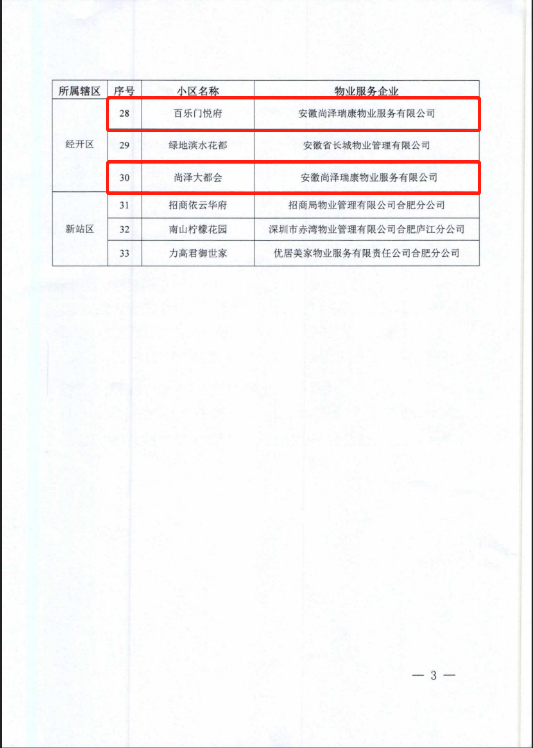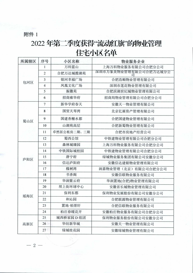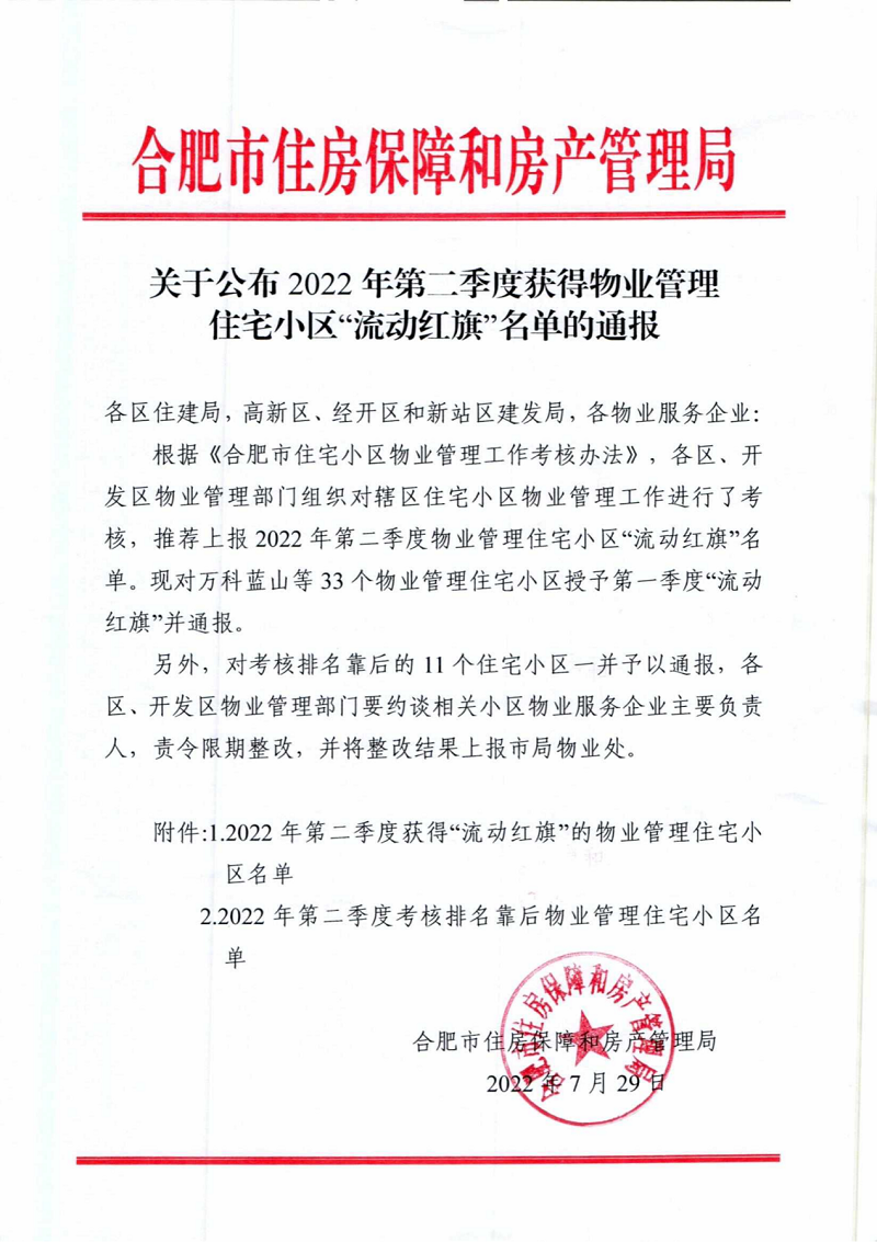 2022年7月29日,尚澤瑞康物業(yè)公司大都會、百樂門雙項目通過2022年第二季度物業(yè)服務(wù)綜合測評,被授予合肥市物業(yè)管理住宅小區(qū)第二季度“流動紅旗”。